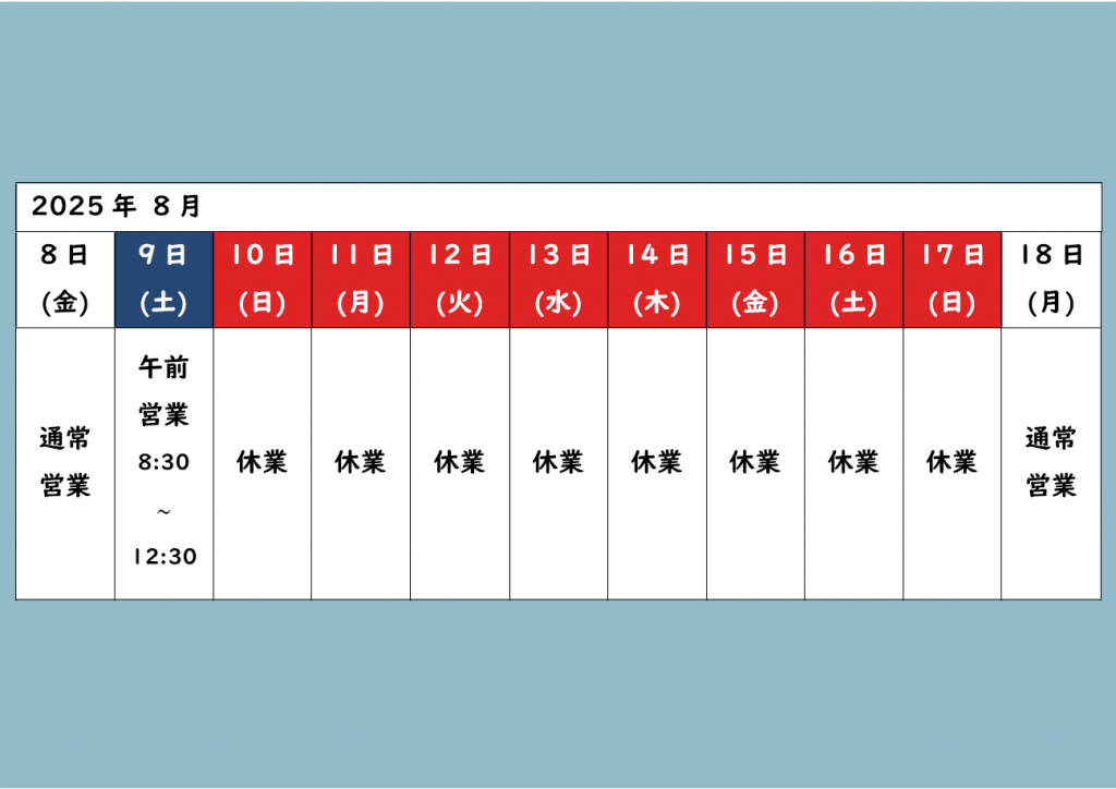 夏季休業のお知らせ 2025.07.28 その他 上記の期間休業とさせていただきます。ご不便をお掛けしますが、何卒ご了承の程お願い致します。 投稿ナビゲーション 前の記事:年末年始休業のお知らせ次の記事:年末年始休業のお知らせ